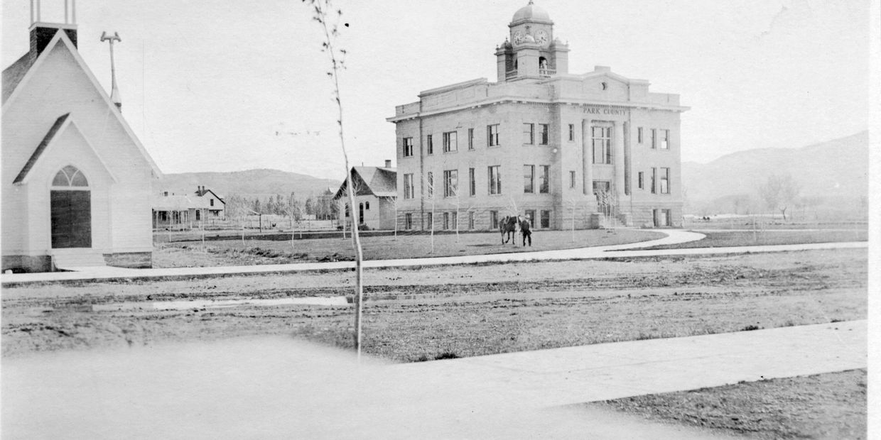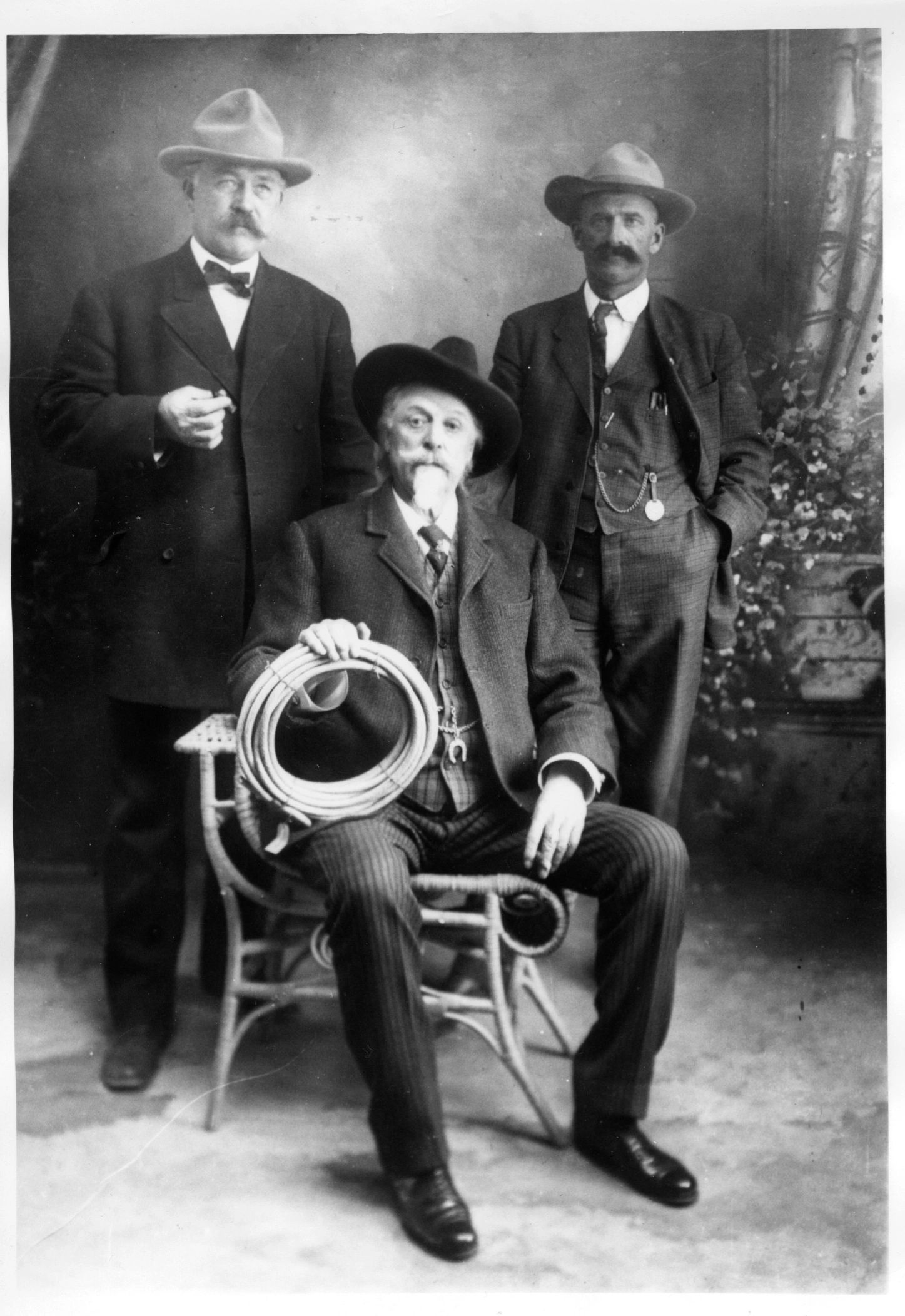 photo to L -- founder and namesake William F. "Buffalo Bill" Cody, seated, with partner George T. Beck, L, and early sheep rancher Henry J. Fulton, R, circa 1910. [Photo Credit-Park County Archives]